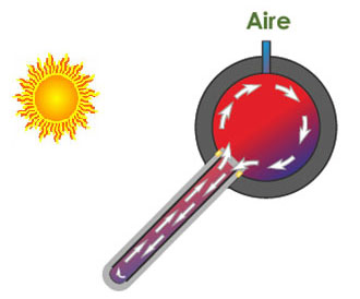 La radiación solar penetra el tubo exterior de cristal y es capturada en el exterior del tubo de cristal interior por una capa difusora altamente selectiva. La captación de radiación solar es transmitida hacia una aleta de aluminio de contacto superficial y desde ésta hacia la tubería de cobre que contiene el fluido caloportador.