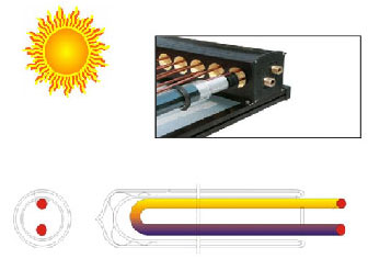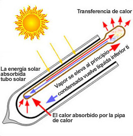 • Heat Pipe (un pipe por tubo): Los tubos de vacío poseen al interior un tubo de cobre, y este en su interior, contiene un líquido vaporizante que a 25°C el fluido se calienta y se vaporiza absorbiendo el calor latente. La radiación solar provoca la evaporación del líquido, haciendo que éste suba al extremo superior del tubo, que al estar más frío hace que el vapor se condense, ceda así su energía al agua de consumo (Cabezas de cobre en el interior del estanque), y regresa en estado líquido por gravedad al extremo inferior del tubo, iniciándose de nuevo el ciclo.